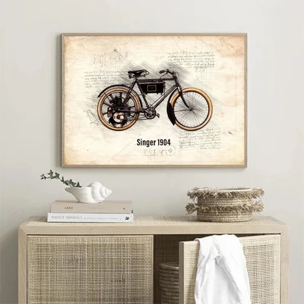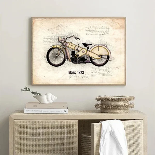 Les visuels disponibles célèbrent l’histoire de la moto : modèles d’époque, moteurs iconiques, silhouettes épurées et ambiance atelier vintage. Le rendu sépia ou beige donne un look intemporel, idéal pour habiller les murs d’un garage, d’un atelier, d’un salon ou d’un bureau. La toile fine montée sur panneau MDF permet également un affichage discret avec un superbe impact visuel.