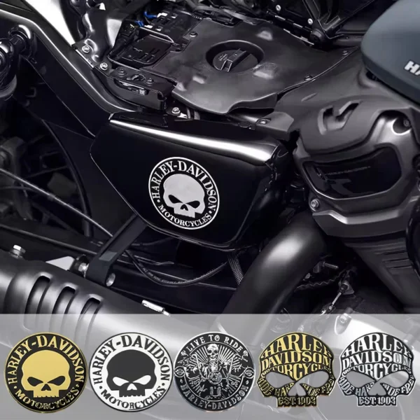 Autocollants moto en alliage d’aluminium style Harley-Davidson. Finition premium, résistants et idéals pour personnaliser moto, casque ou voiture.