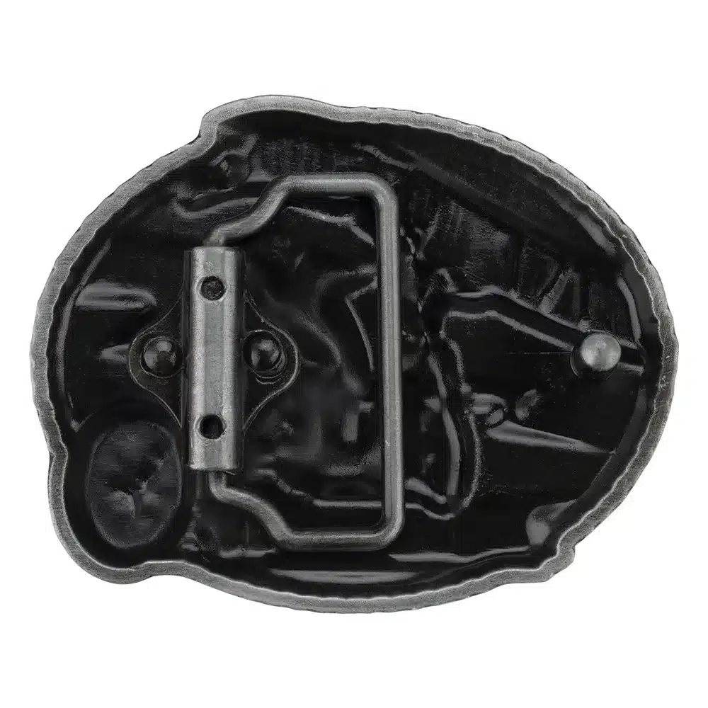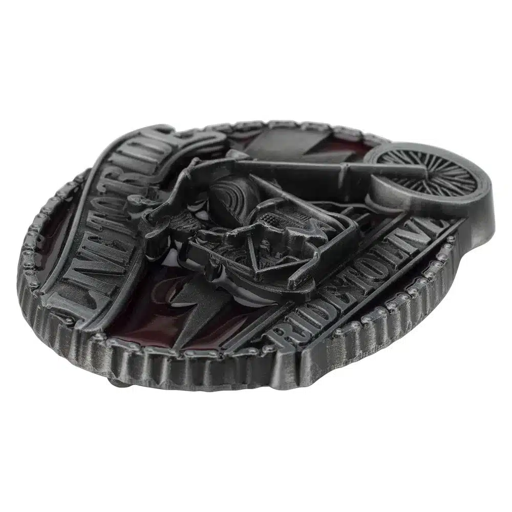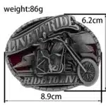 Avec cette boucle « Live to Ride, Ride to Live », affichez votre passion pour la route et le style biker jusqu’au moindre détail. En métal finition gris vieilli, elle représente un motard armé sur sa machine, dans une posture agressive et libre. Parfaite pour accompagner une ceinture western ou un jean brut, elle se fixe en quelques secondes grâce à son système universel à clipser.