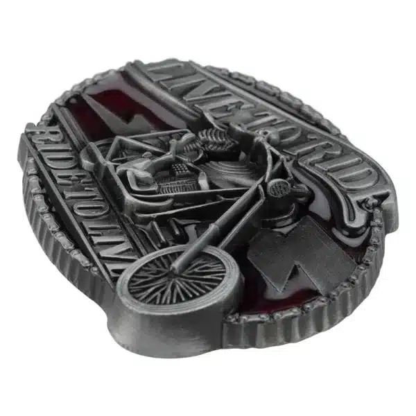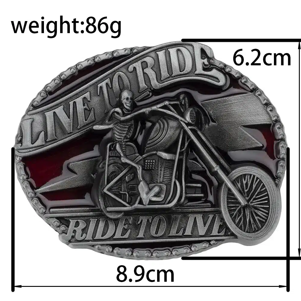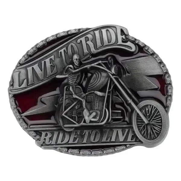 Boucle de ceinture biker métal avec slogan « Live to Ride ». Style vintage brut, parfaite pour ceintures western 3,8 cm. Fixation simple à clipser.