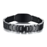 Bracelet homme en acier inoxydable noir avec motif scorpion et croix. Bijou masculin robuste, élégant et personnalisable, idéal comme cadeau.
