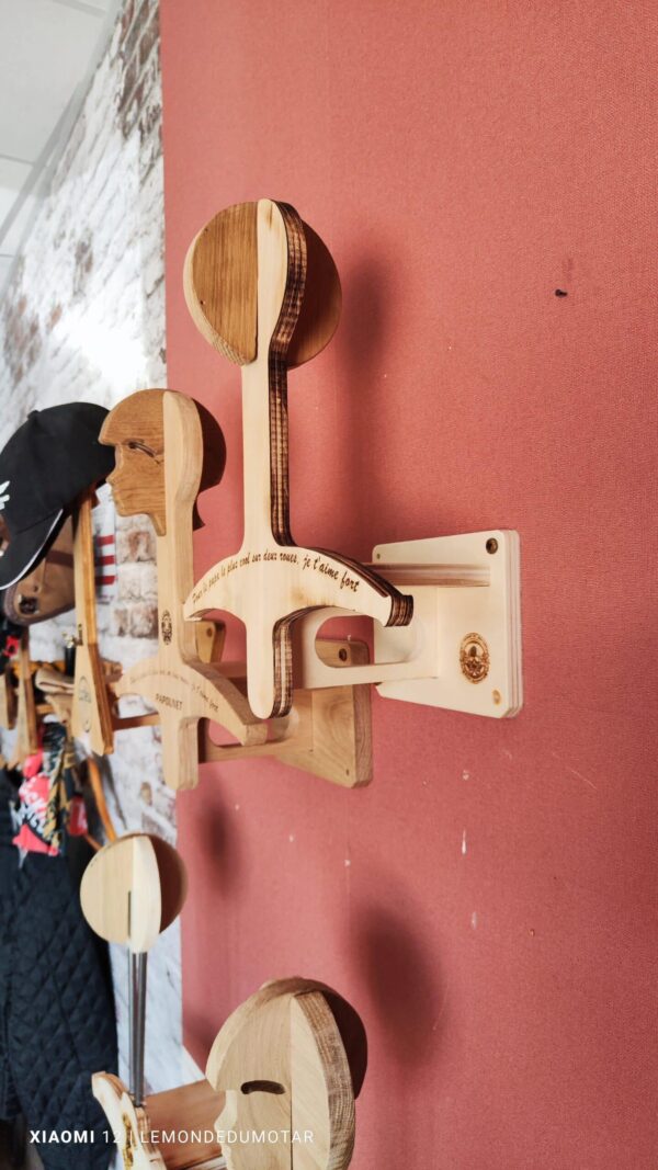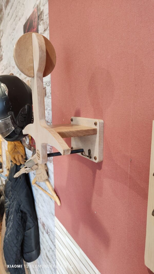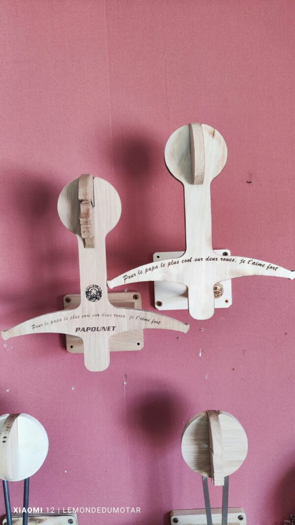 Offrez le Cadeau fête des Pères, offrez un Porte-Casque moto Mural en Chêne Massif ou CP de Peuplier , alliant fonctionnalité et design. Choisissez entre le charme robuste du Chêne Massif ou la légèreté raffinée du CP de Peuplier. Chaque porte-casque est fabriqué à la main par des artisans passionnés, garantissant un produit unique et de haute qualité.