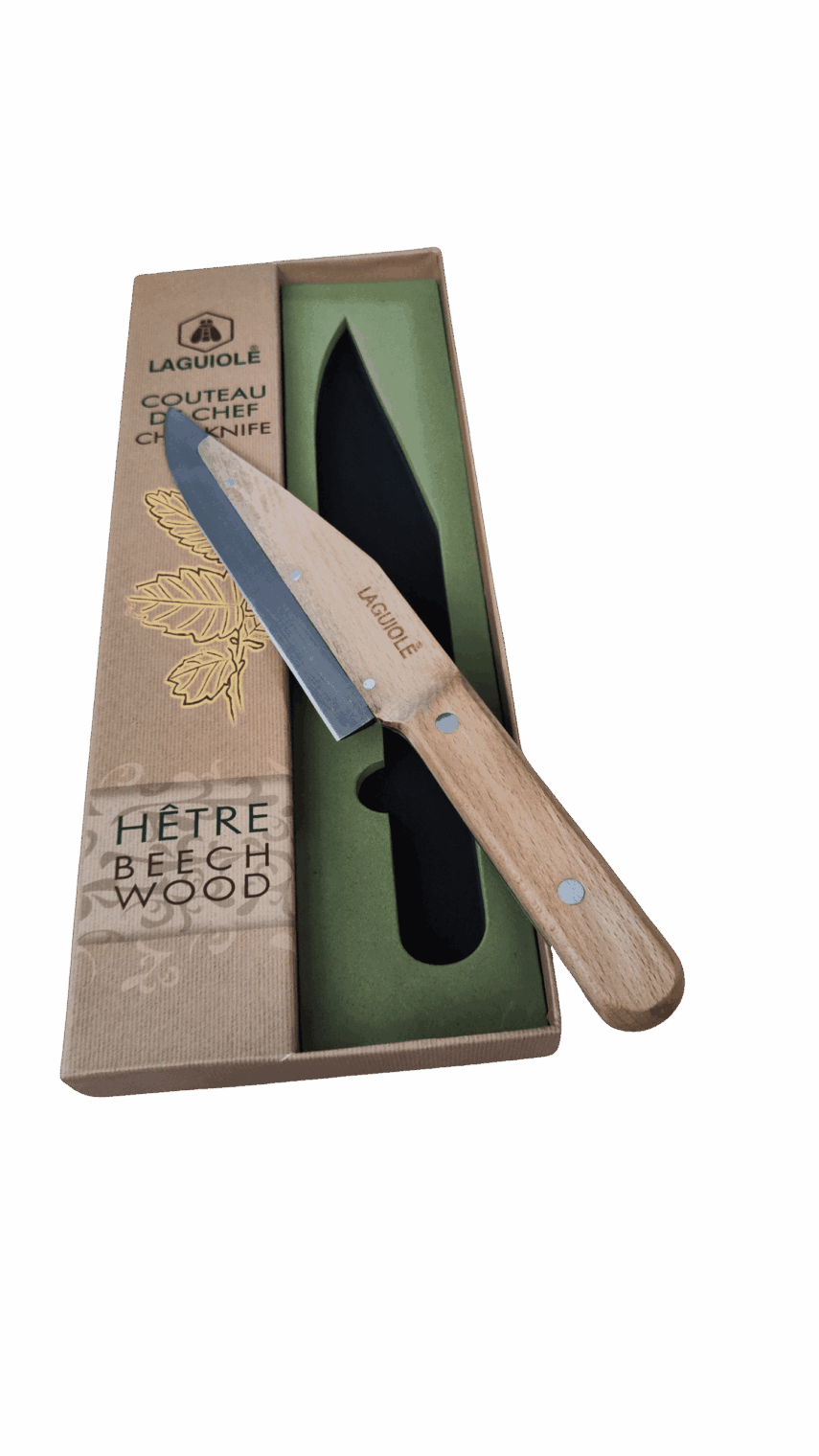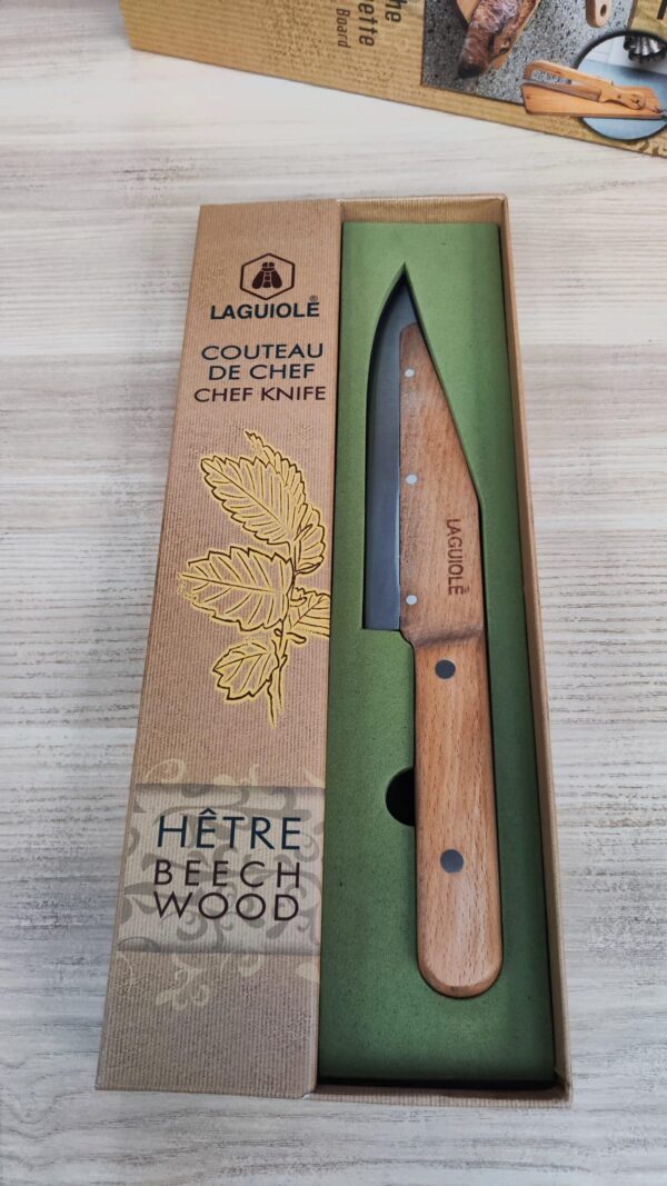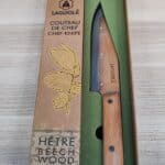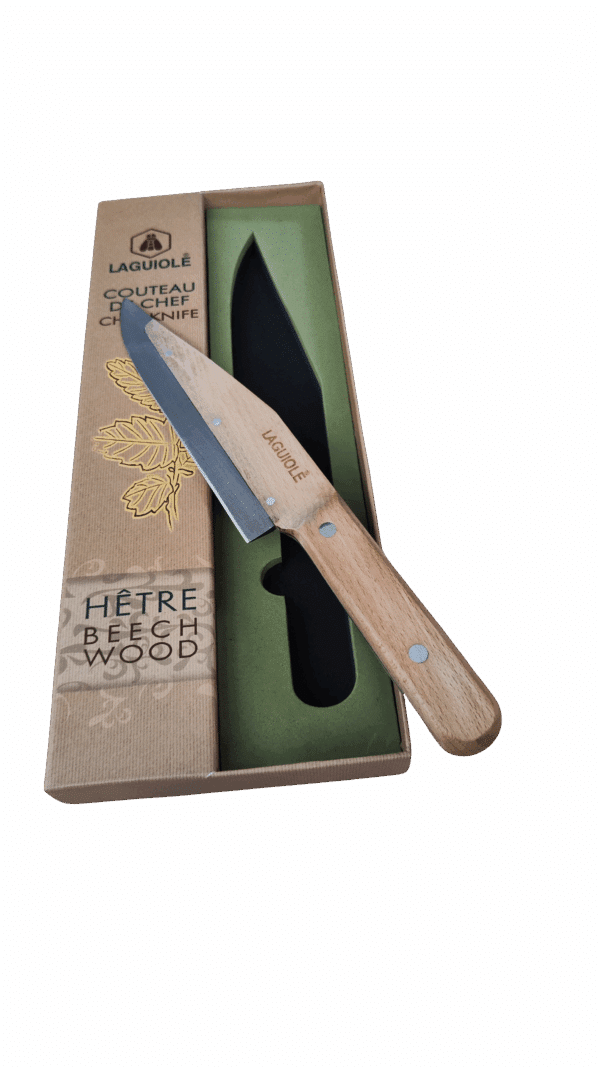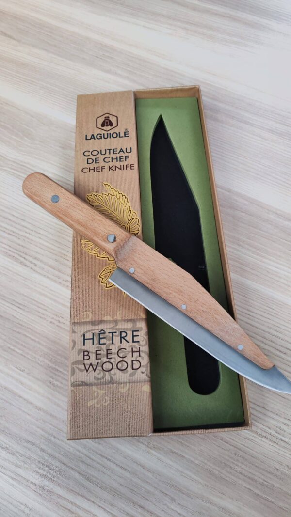 Le couteau de chef Laguiole , avec son manche en bois de hêtre et sa lame en acier inoxydable, est un indispensable pour les motards passionnés de cuisine.