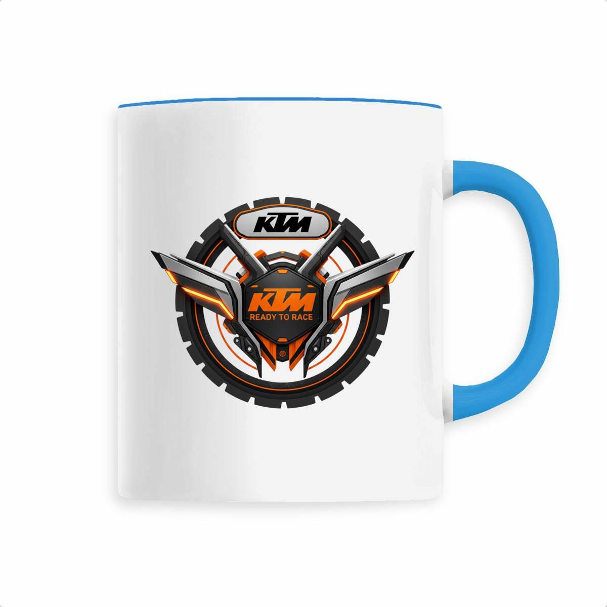 Mug KTM en céramique 330 ml avec logo revisité racing. Impression recto/verso, compatible lave-vaisselle et micro-ondes. 18 designs au choix + personnalisation possible (+5 €).