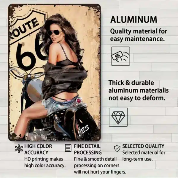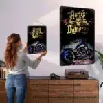 Cette plaque décorative Harley Route 66 illustre l’esprit de liberté et de voyage cher aux bikers. Son style vieilli et authentique met en valeur les détails de la moto, des pin-up et de l’imagerie Route 66. Accrochée dans un garage, une chambre ou même un bureau, elle attire immédiatement le regard et impose une ambiance motarde assumée.