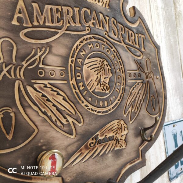 Porte casque INDIAN grand model en bois brûlé ( clair ou foncé) avec porte blouson , porte clef et porte gants