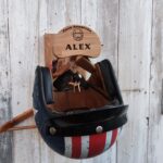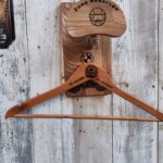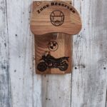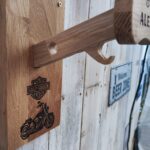 Porte casque Baby Lux en chêne massif, gravé à la main et personnalisable avec prénom, logo ou moto. Fait main, solide et design, parfait pour casque, blouson, gants et clés.