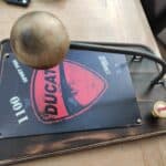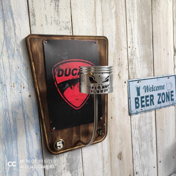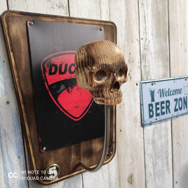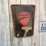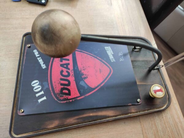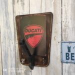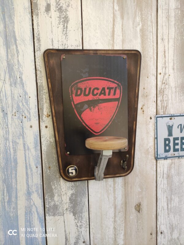 Le Porte casque moto Ducati little et composé de : Logo Ducati sur plaque métallique laqué sur un support en bois brulé.