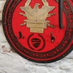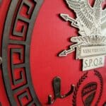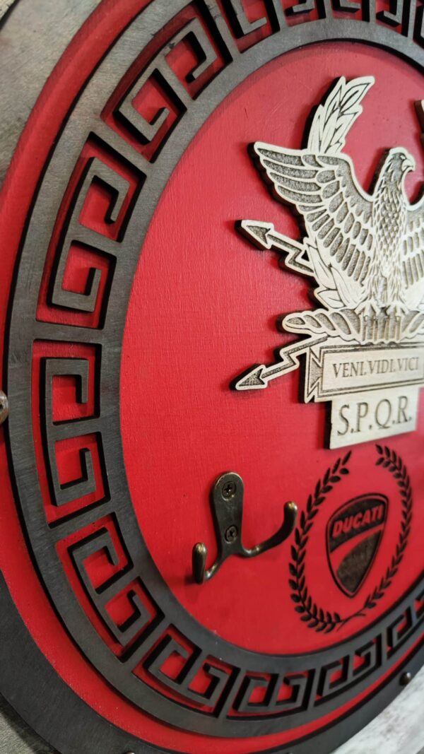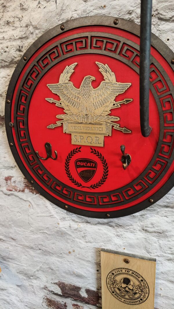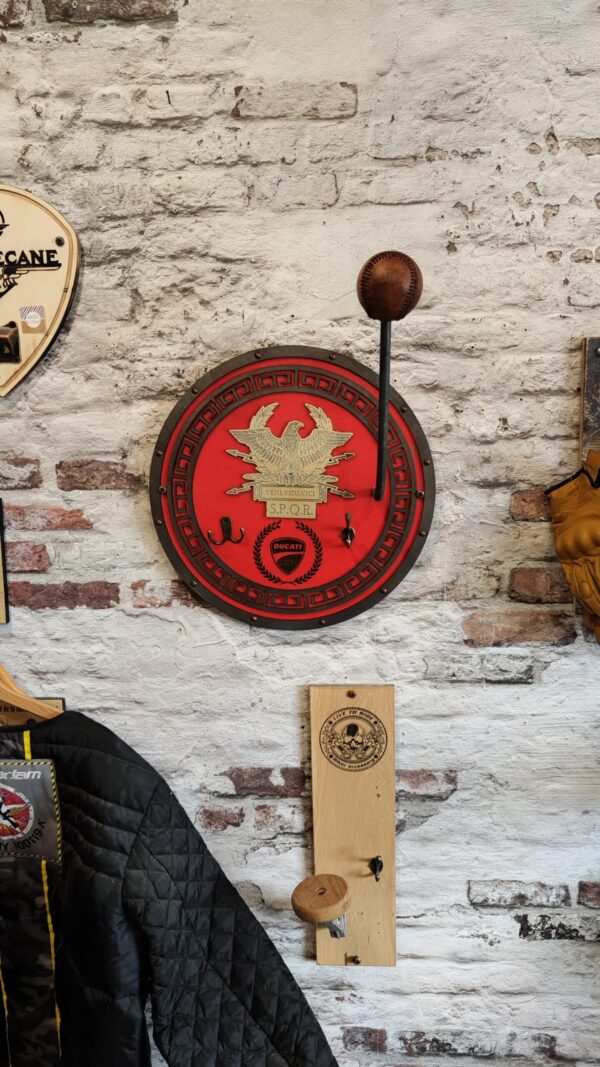 Porte casque moto romain en bois, inspiré de l’Empire romain, avec des gravures détaillées de l’aigle et de l’inscription SPQR. Ce support élégant et fonctionnel est fait main, robuste, et idéal pour les passionnés de moto et d’histoire. Livraison gratuite et garantie de 2 ans incluses