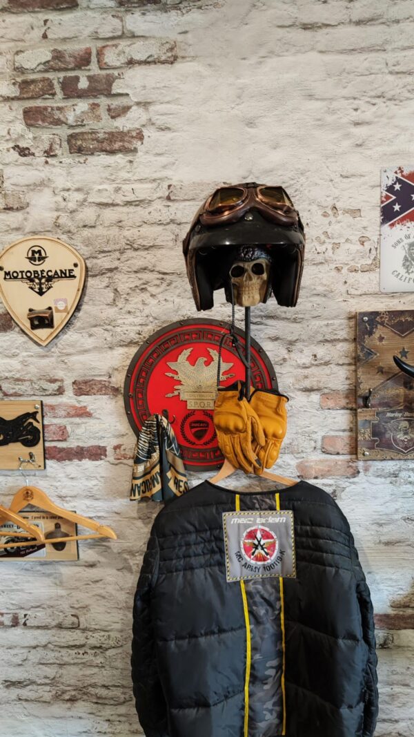 Il est doté de crochets pratiques pour accrocher vos accessoires, tels que gants ou vestes. Idéal pour un usage quotidien, il offre un aspect fonctionnel et esthétique pour les amateurs d’histoire ou de décoration moto. Pour encore plus de personnalisation, vous pouvez ajouter une gravure gratuite sur ce porte-casque, le rendant ainsi encore plus spécial.