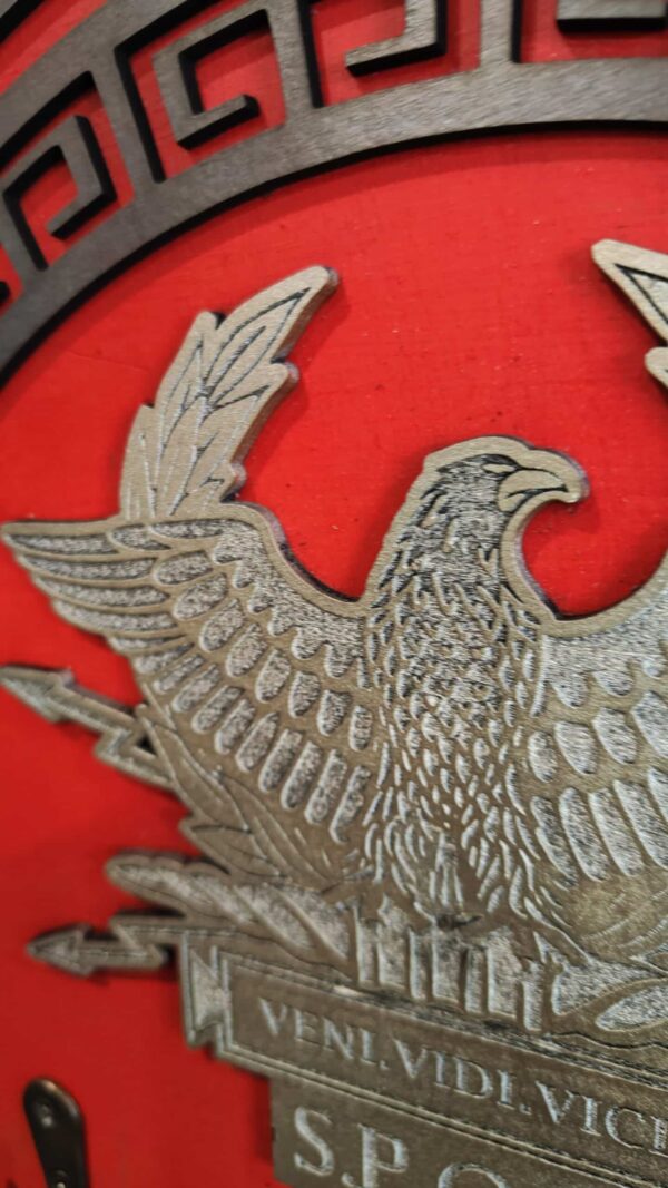 Ce modèle artisanal est gravé avec des détails minutieux tels que l’aigle impérial et l’inscription « SPQR », emblèmes emblématiques de la puissance romaine. En plus d’apporter une touche majestueuse à votre espace, ce porte-casque vous permet de suspendre et protéger votre casque avec style.