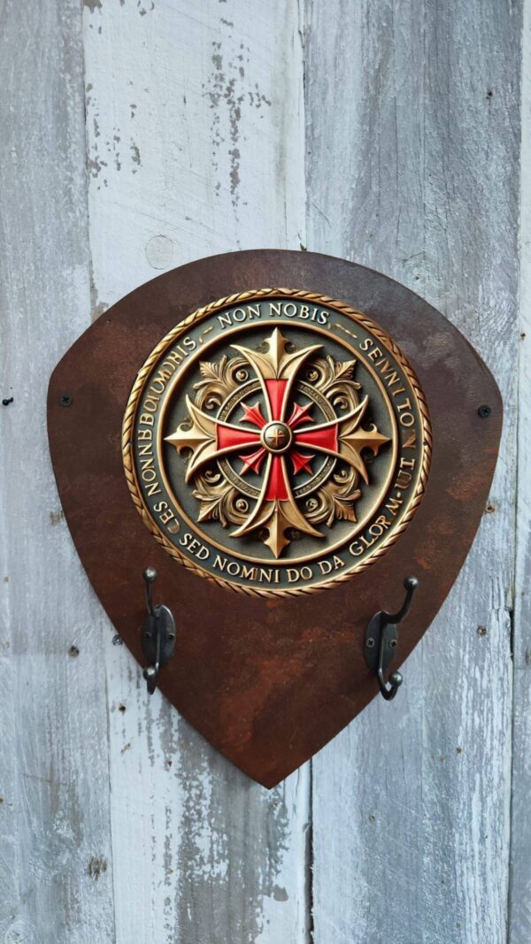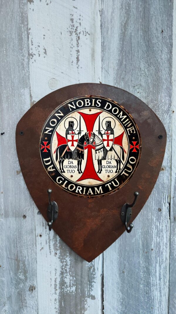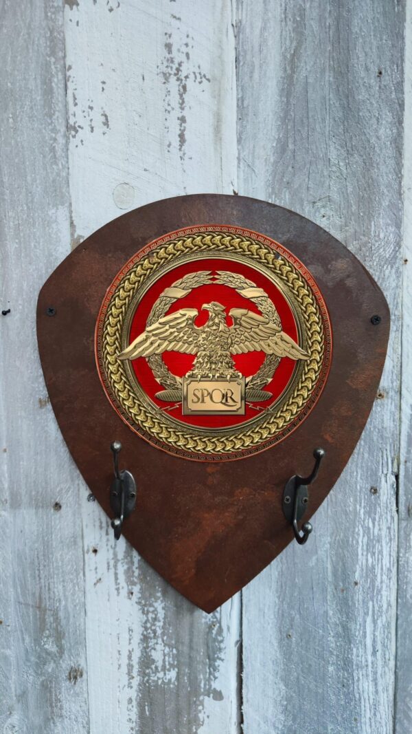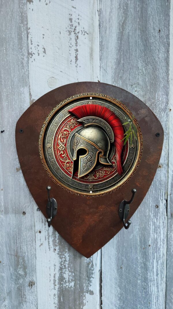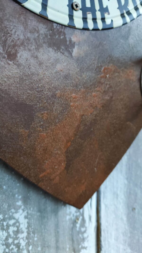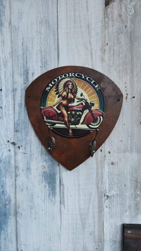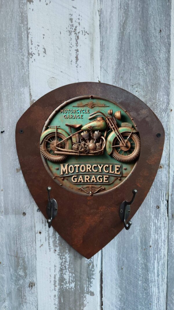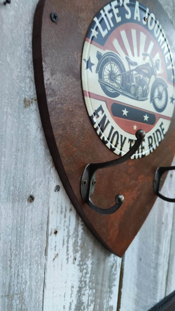 Porte-manteaux écusson rouillé avec plaque métallique ronde et crochets en métal pour casque et accessoires. Design rétro, parfait pour les passionnés de moto.