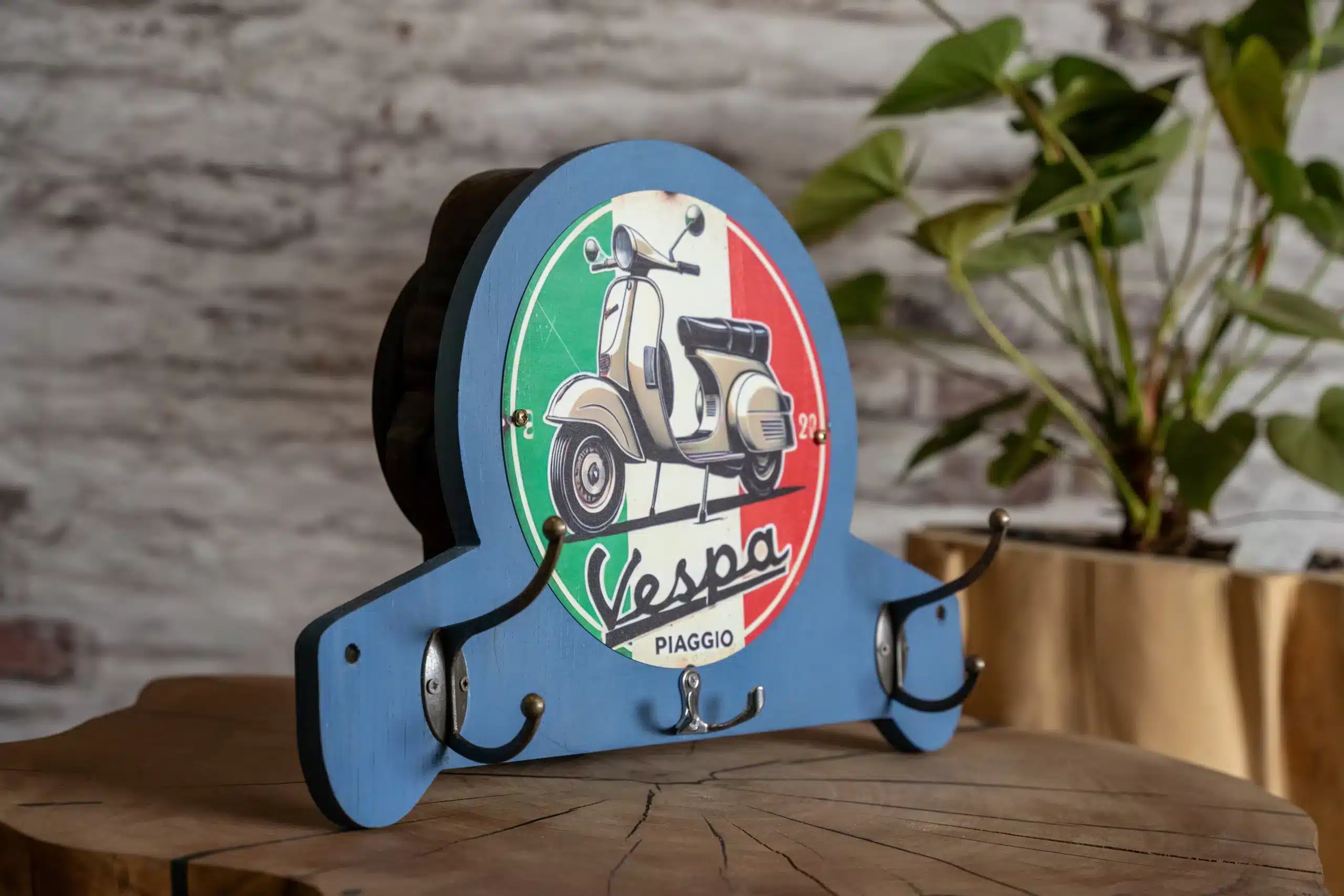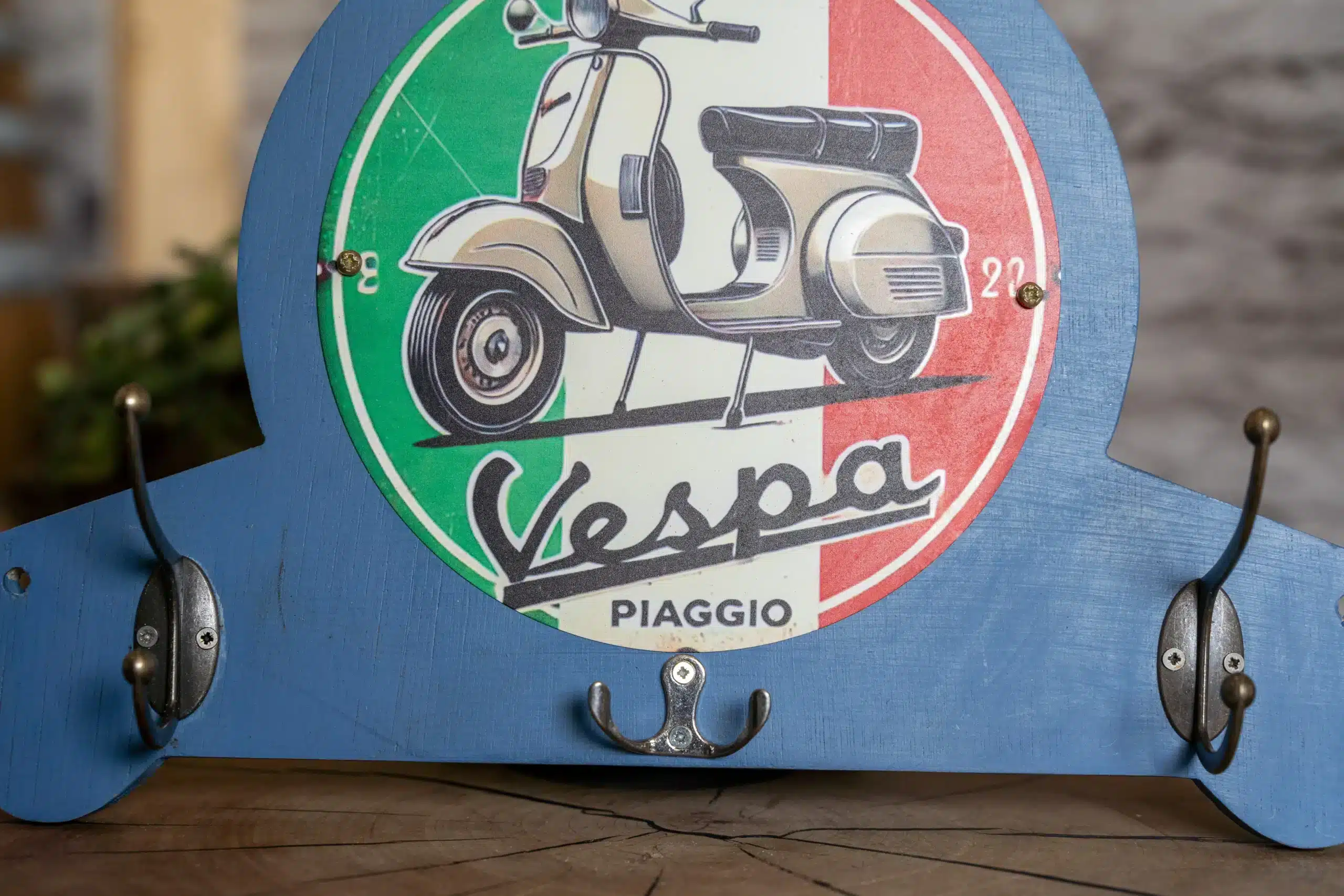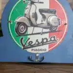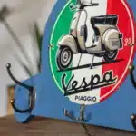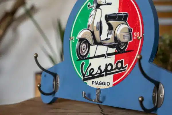 Porte-manteaux Vespa en métal avec plaque décorative ronde et crochets pratiques pour casque, gants et clés. Design rétro idéal pour les passionnés de scooters.
