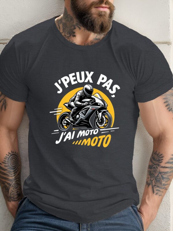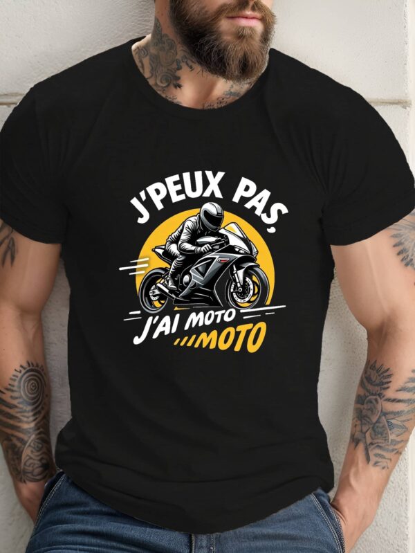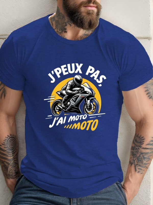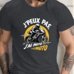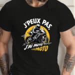 T-shirt homme « J’peux pas, j’ai moto… MOTO ». Humour motard, imprimé stylé, coupe confortable. Idéal pour les passionnés de deux-roues et les fans d’autodérision.