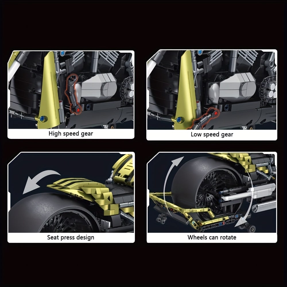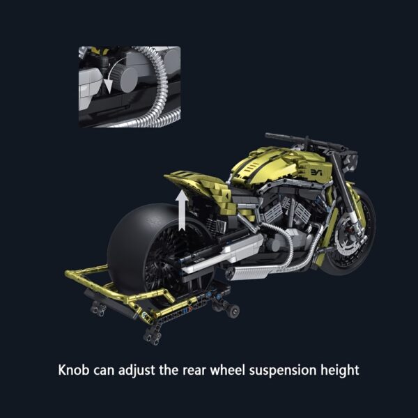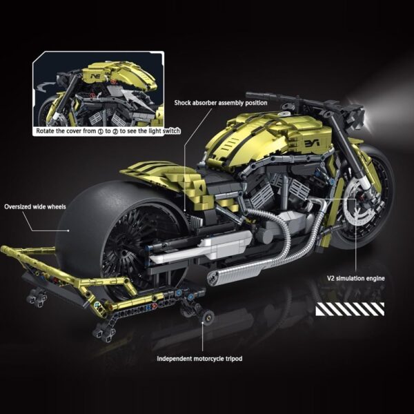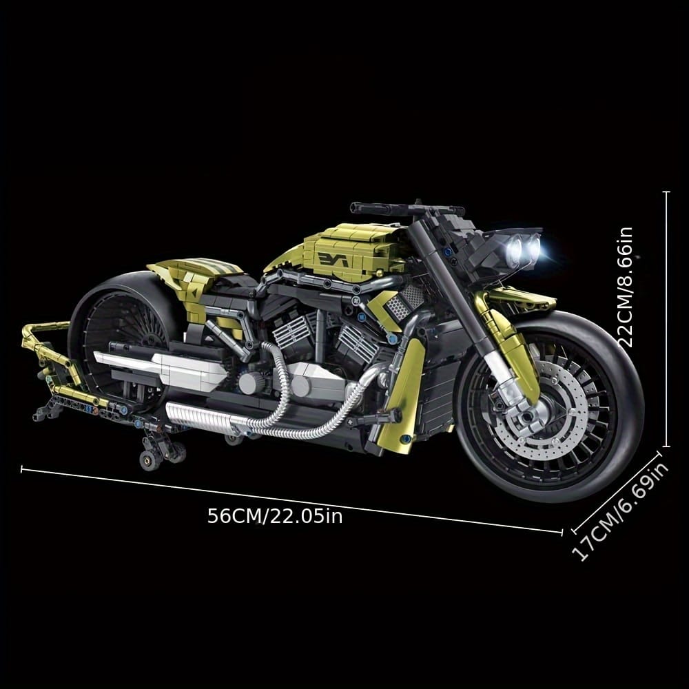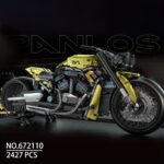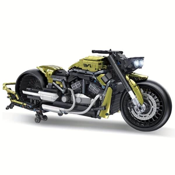Passionné de motos et de mécanique ? Ce kit moto MOC à assembler est fait pour vous. Avec ses 2427 pièces et son design spectaculaire à l’échelle 1:5, il reproduit une moto noire et or au style musclé, proche des modèles américains custom.