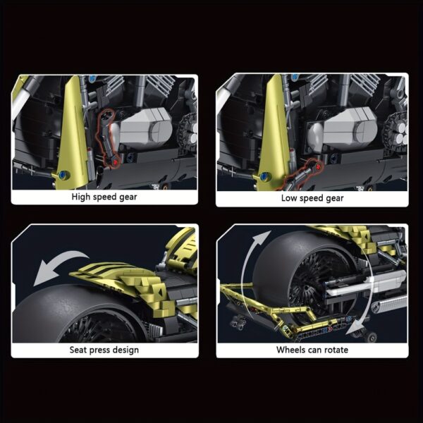 Maquette moto MOC 1:5 à construire – 2427 pièces, design noir et or, moteur détaillé, kit idéal pour passionnés de technique et de moto.